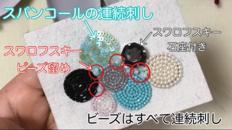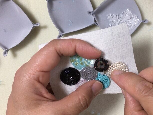 私がよく使う材料は、4mmのスパンコールや六角小ビーズ、3cutビーズ、丸小ビーズなど。特にお気に入りは、パール3mmとクリスタルです。