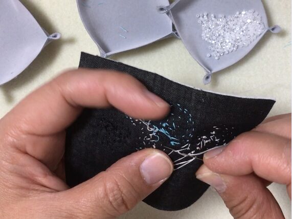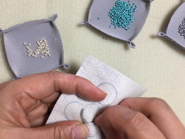 基本は「2粒通して1粒戻る」リズムで丁寧に縫いつけていきます。慣れてきたら2〜4粒まとめて縫うこともありますが、糸の挽き加減には特に注意しています。強く引きすぎると布がよれてしまうので、「ふんわり」を意識しています。きれいな円を作るには基本の2粒で刺す方がおすすめです。
